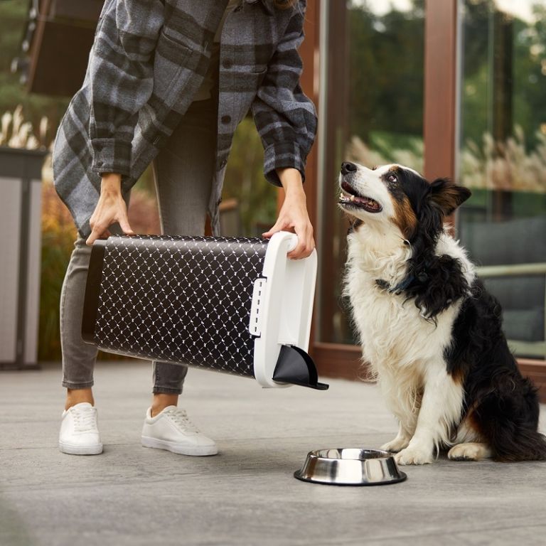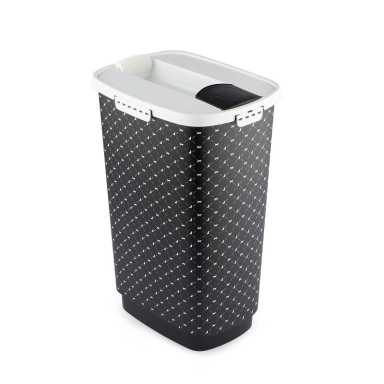 Úložný box na suché krmivo. Součástí je i praktická lopatka. Vyklápěcí dávkovač ve víku – pro jednoduché dávkování a odsypávání krmiva. Spolehlivé vzduchotěsné uzavření víka díky bočním klipsům. Ergonomický tvar umožňuje pohodlné uchopení. Vyrobeno z plastu vhodného pro potraviny (PP). Pěkný moderní design. Kvalita od švýcarské značky Rotho.