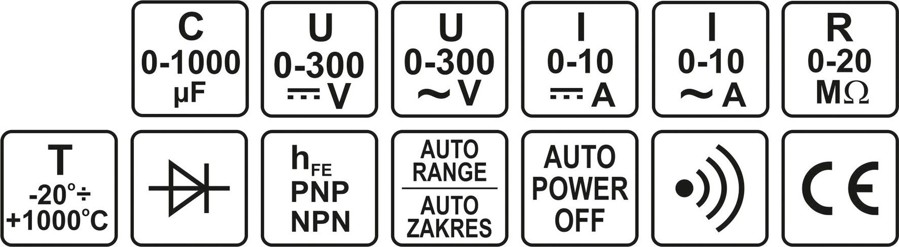 Multimetr, je měřič umožňující měření elektrických veličin. Tento měřák umožňuje měření střídavého a stejnosměrného napětí, proudu i odporu, kapacity a teploty. Navíc je tento multimetr vybaven testovacím slotem pro kontrolu tranzistorů a zároveň umí testovat i diody. Mezi jednotlivými typy měření se přepíná pomocí otočného voliče, kde lze rovněž nastavit požadovaný rozsah u jednotlivých veličin. Naměřené hodnoty se zobrazují na přehledném LCD displeji odolného, plastového těla přístroje. Tělo je navíc umístěno v sundavacím silikonovém obalu, který zajišťuje částečnou ochranu před vlhkostí, nečistotmi a v neposlední řadě chrání přístroj před vibracemi. K měřiči jsou přiloženy kvalitní kabely s měřícími hroty.