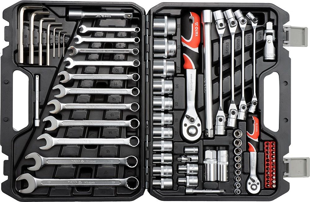 Gola sada 1/2″, 1/4″ obsahuje 77ks: nástavců, prodlužovacích nástavců, ráčny s plastovou rukojetí a 72 zubým jemným chodem, kloubové nástavce, očkoploché klíče, imbusové klíče a další příslušenství. Vyrobené z kvalitní chromvanadiové oceli CrMo440, CrV6150 a CrV50BV30, S2 s funkcí AS-DRIVE. Funkce AS-DRIVE umožňuje vyvinout větší kontaktní sílu, neboť ke kontaktu se šroubem nedochází na hranách šestihranu, nýbrž v první třetině styčných ploch. Tím nedochází k poničení hlavice šroubu. Ořech mnohdy povolí i matice a šrouby již poničené.