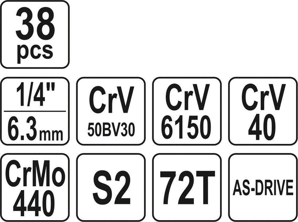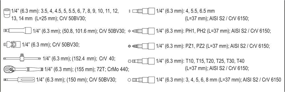 - Torx 1/4 „: T10, T15, T20, T25, T30, T40 (37 mm)