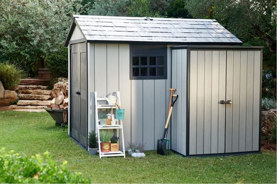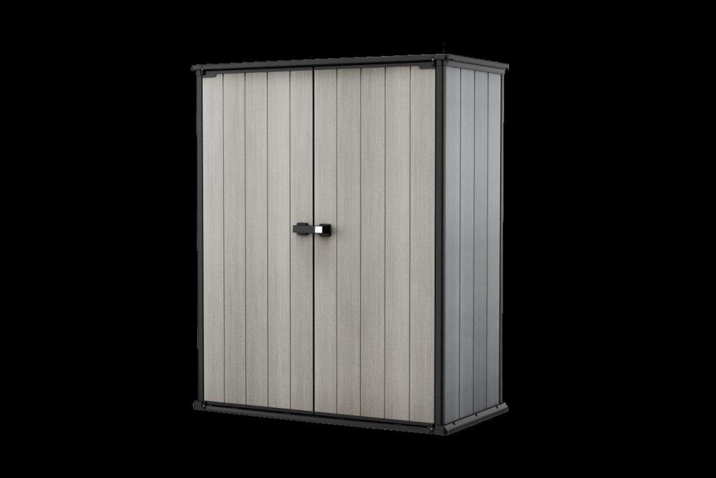 Zahradní skříň High Store Plus Duotech v šedé barvě patří do produktové řady Duotech. Svým designem připomíná vitage dřevěné palubky. Velkou výhodou jsou dvojité dveře, práh se sklonem a možnost uzamčení. Jednoduchý design skříně klade důraz na dlouhou životnost, jednoduchou údržbu a především na sladění s moderními i klasickými zahradami. Díky prostornému vnitřnímu místu uložíte bez námahy i těžké zahradní vybavení a nářadí. Celou montáž zvládnete s použitím běžného domácího nářadí. Tato nízkoúdržbová skříň je odolná vůči rzi, hnilobě a dalším poškozením způsobených nepříznivým počasím. Inovativní materiál DUOTECH™ z umělé pryskyřice vzhledem připomíná broušené dřevo, ale narozdil od něj je pevný delší dobu a odolný vůči okolním přírodním vlivům. Vystužené dvojité stěny DUOTECH™ můžete natřít podle vašeho vkusu. Takto upravné boční panely doplňuje masivní podlahový panel, takže dohromady unesou i nejtěžší vybavení. Podlaha má práh s mírným sklonem pro snazší vyndavání nářadí.