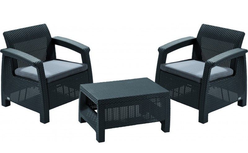Souprava Corfu WEEKEND je menší moderní posezení jak ven, tak do interiéru. Souprava je vyrobena z lisovaného plastu v imitaci plochého ratanu. Set je doplněn o podušky, které zajistí ještě větší pohodlí. Jedná se o velmi oblíbenou soupravu. Skládá se ze dvou křesílek a stolku. Jednoduchá montáž i údržba.