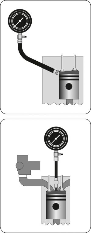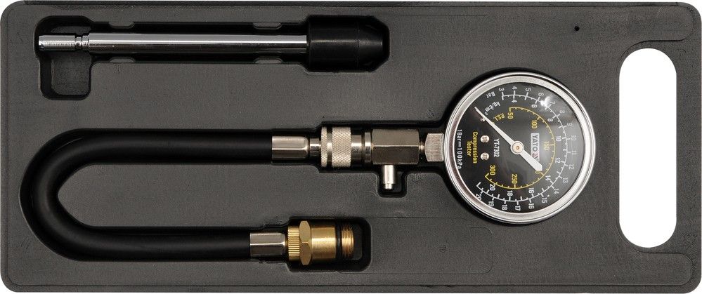 Profesionální sada pro měření kompresního tlaku spalovacích motorů. Zařízení se umístí místo zapalovací svíčky motoru a určí se tlak pro daný válec. Sada je opatřena nástavcem s gumovým zakončením a také hadičkou se zakončením se závitem pro montáž u motorů s hluboko zapuštěnými svíčkami. Zařízení je vhodné pro diagnostiku a mechanický stav motoru a je umístěno v praktickém kufříku.