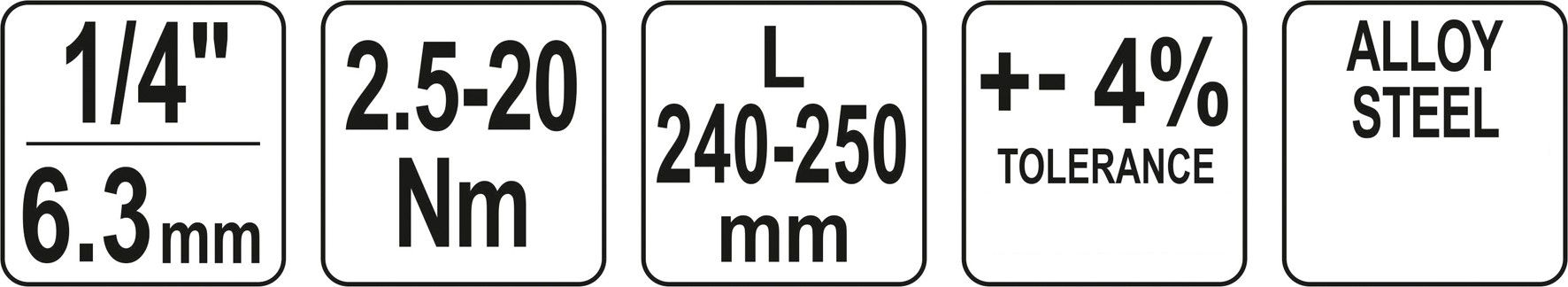 Momentový klíč Yato s pracovním rozsahem. Výstup 24 zubé ráčny tvoří čtyřhran 1/4″. Nastavený moment je fixován aretačním šroubem. Momentový klíč je vyroben z legované oceli.