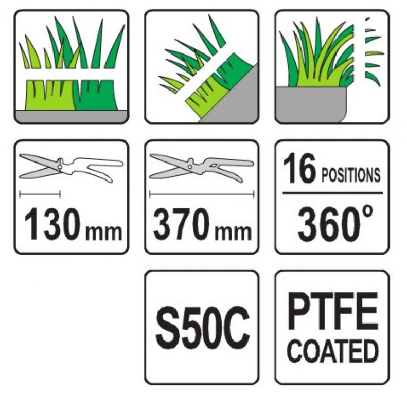 Praktické zahradní nůžky na trávu o celkové délce 370 mm. 16 pozic nastavení. Hlavice otočná o 360 stupňů. Ostří o délce 130 mm, vyrobené z materiálu S50C je potažené PTFE. Ideální pro přesný střih okraje trávníků či střih trávníku v těžko přístupných místech. Rukojeť nůžek je uzavřená, opatřená protiskluzovou ochranou pro komfortní práci.