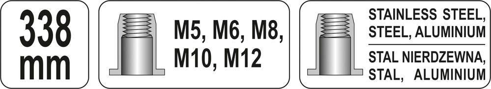 Vysoce kvalitní, nýtovací pákové kleště pro maticové nýty. Délka kleští 338 mm, tělo je zhotoveno z hliníku ADC12, rukojeti pak z uhlíkaté oceli. Celá sada je uložena v praktickém kufru.