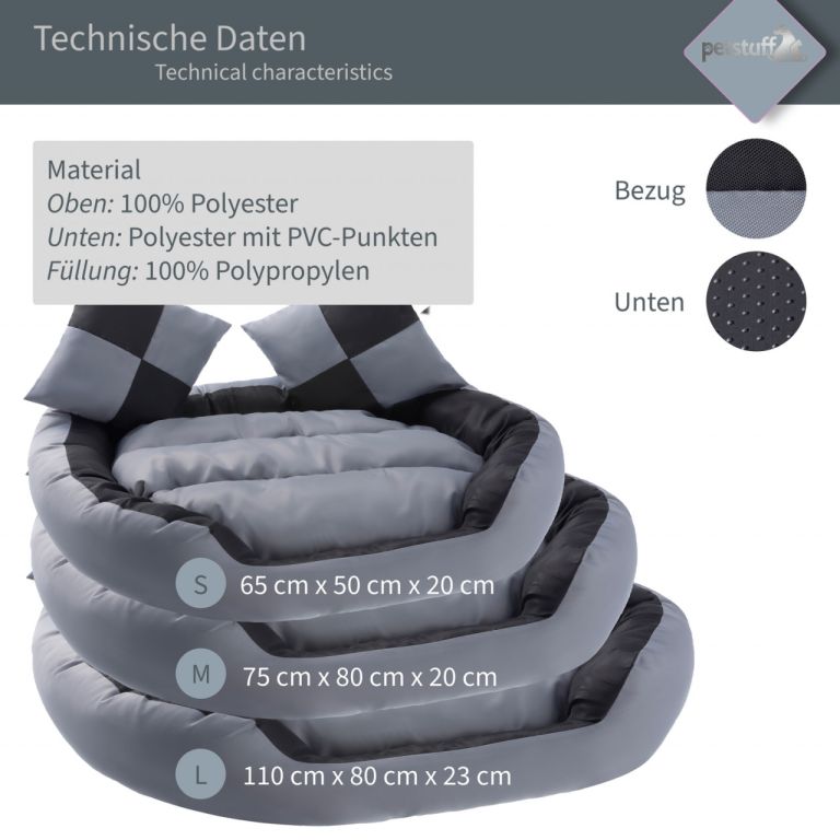 Tento pelíšek je příjemným místem na spaní pro psa, kočku nebo jiné domácí mazlíčky. Náš pelíšek je vhodný také jako doplněk k boudě nebo přepravnímu boxu. Je obzvláště pohodlný díky měkké výplni a odnímatelnému oboustrannému polštáři, který je šetrný i ke kloubům čtyřnohého přítele. Kryt je vodoodpudivý, aby se zabránilo přímému vniknutí kapalin. Celý pelíšek lze prát ručně nebo v pračce při nízkých teplotách. Spodní strana koše pro psy je opatřena dalšími protiskluzovými výstupky.