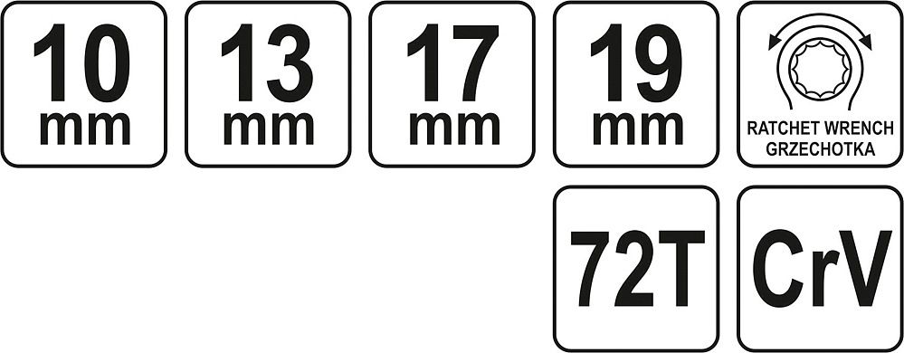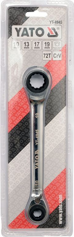 Ráčnový, oboustranný, průchozí klíč s ráčnami 10 x 13 mm a 17 x 19 mm. Klíč byl vyvinut tak, aby vyhovoval potřebám specializovaných automobilových a jiných mechanických dílen. Zhotovení klíče z kvalitní chromvanadiové slitiny oceli CrV zajišťuje dlouhou životnost a korozivzdornost.