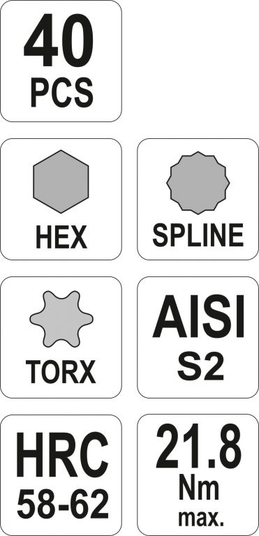 - 7 x bit TORX T20, T25, T30, T40, T45, T50, T55 (30 mm)