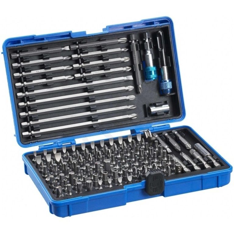 V praktickém kufříku z odolného plastu tak najdete bity se speciálně zakaleným povrchem a jádrem z vysoce kvalitní chrom-vanadové oceli. Ideálně se tak hodí pro průmyslové použití. Pevný plastový pořadač s dlouhou životností leží v robustní odolné kazetě s pojistným zámkem, který zabraňuje samovolnému otevření. V sadě naleznete bity C6.3 (25 mm), bity E6.3 (50, 75, 150 mm), speciální bit na utáhnutí / povolení háků a magnetické držáky bitů.