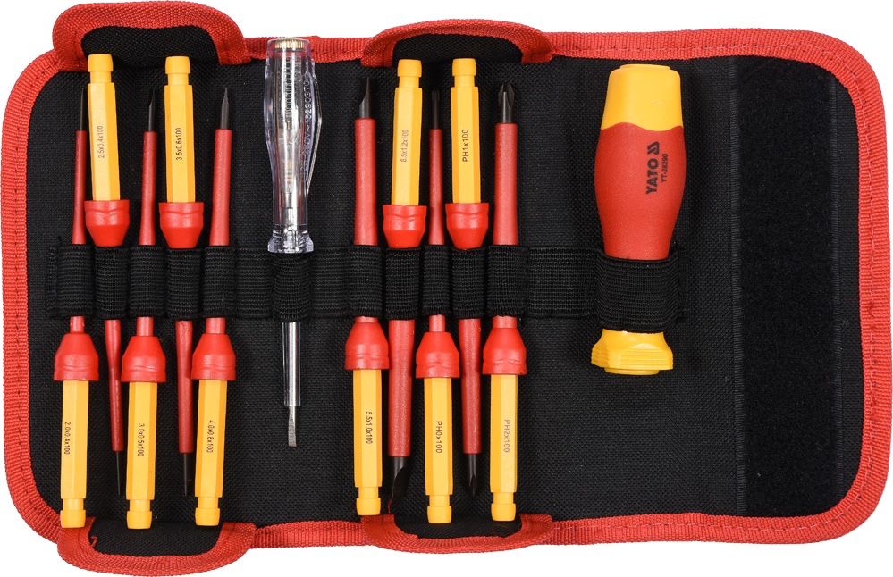 Izolovaný šroubovák v sadě s 10 výměnnými koncovkami a zkoušečkou napětí. Má izolovanou rukojeť s certifikátem VDE, zaručující izolaci až do 1000 V. Nástroj může být bezpečně použit při práci u nízkonapěťových instalací.