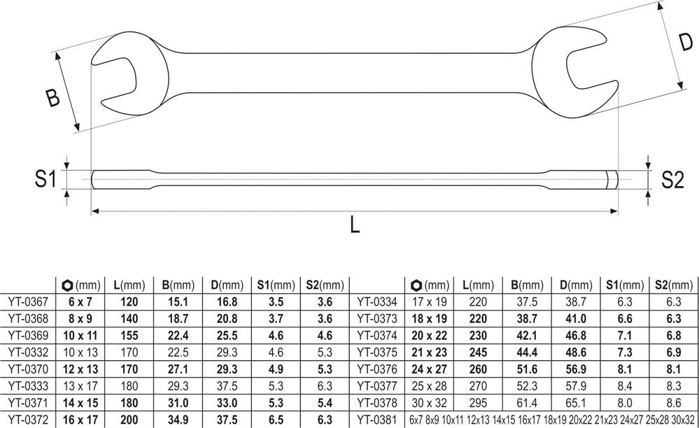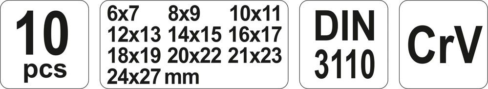 Sada 10 kusů stranových klíčů 6 – 27 mm vyrobených z kvalitní chrom vanadiové slitiny oceli, uložených v odolném pouzdře ze silné syntetické tkaniny, umožňující zavěšení. Kvalita značky Yato.