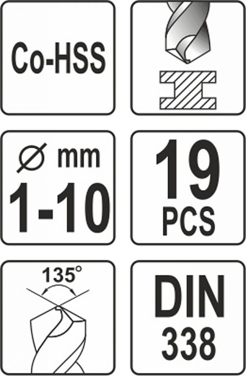 Sada spirálových vrtáků z legované rychlořezné oceli podle normy DIN 338. Vrtáky obsahují 5% cobaltu a jsou odolné vůči vysokým teplotám. Tyto vrtáky jsou vhodné pro použití do legované i nelegované oceli do pevnosti v tahu 900 N/mm2, do nerezové oceli V2A/V4A, do šedé litiny, ocelolitiny a do oceli odolné vůči kyselinám a vysokým teplotám.