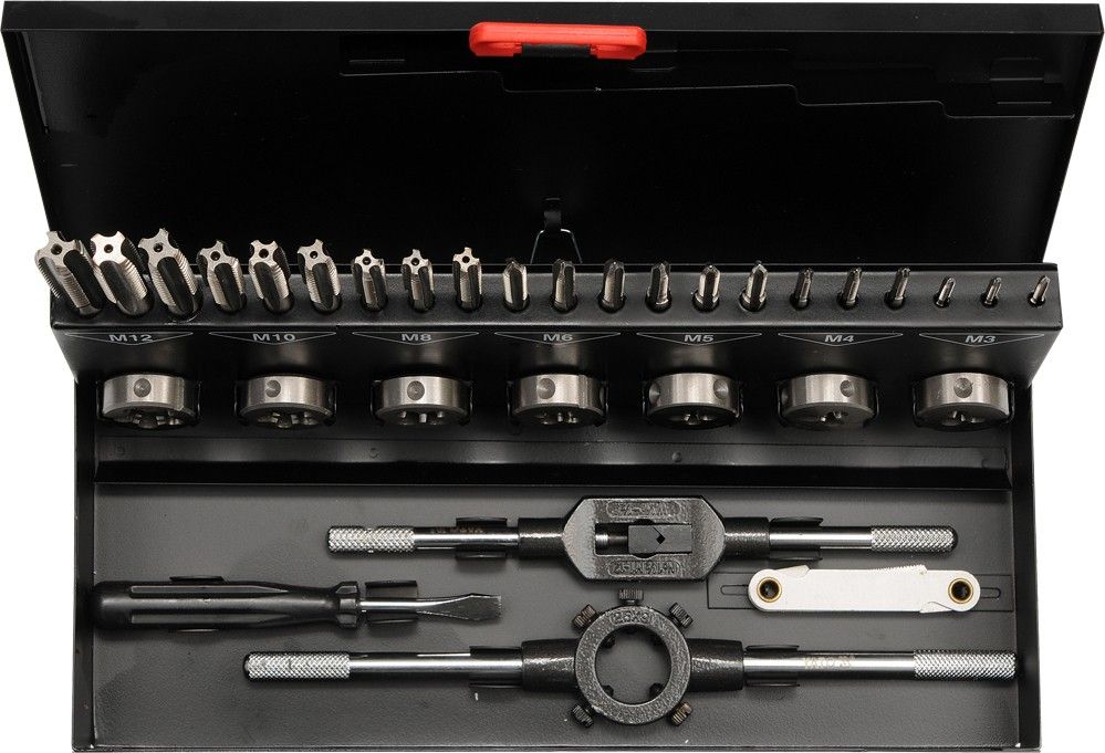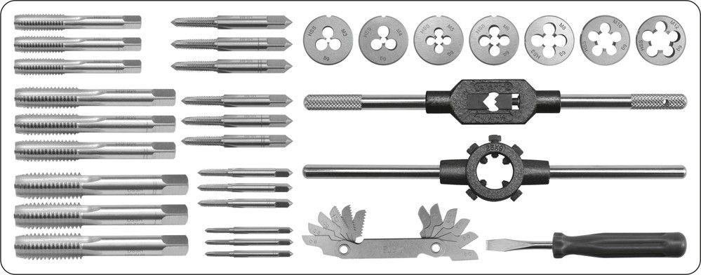 Sada kvalitních závitníků a oček vyrobených z rychlořezné oceli HSS.