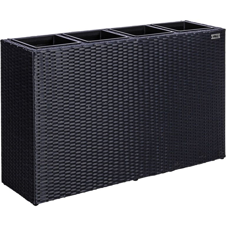 Květináč se 4 vnitřními květníky je ideální pro výsadbu na zahradě, na terase, na balkoně nebo v bytě. Květináč lze použít také jako rozdělovač místností. Polyratan z plastových vláken vyniká vynikajícími vlastnostmi: odolává povětrnostním vlivům, UV záření, odpuzuje nečistoty a snadno se čistí. Tato sada květináčů se skládá z polyratanového rámu a čtyř vyjímatelných plastových květináčů s uzavíratelným odtokem vody.