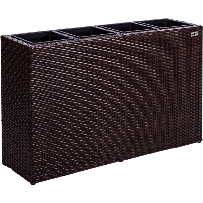 Květináč se 4 vnitřními květníky je ideální pro výsadbu na zahradě, na terase, na balkoně nebo v bytě. Květináč lze použít také jako rozdělovač místností. Polyratan z plastových vláken vyniká vynikajícími vlastnostmi: odolává povětrnostním vlivům, UV záření, odpuzuje nečistoty a snadno se čistí. Tato sada květináčů se skládá z polyratanového rámu a čtyř vyjímatelných plastových květináčů s uzavíratelným odtokem vody.