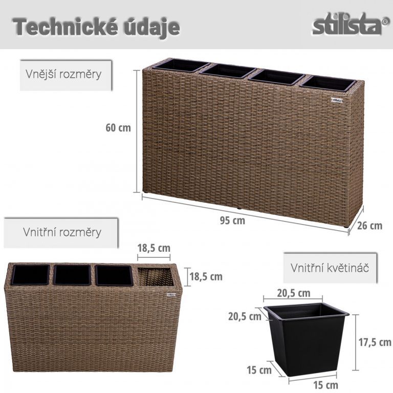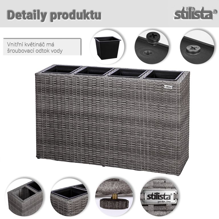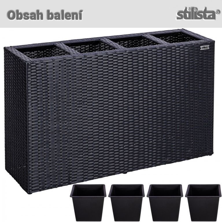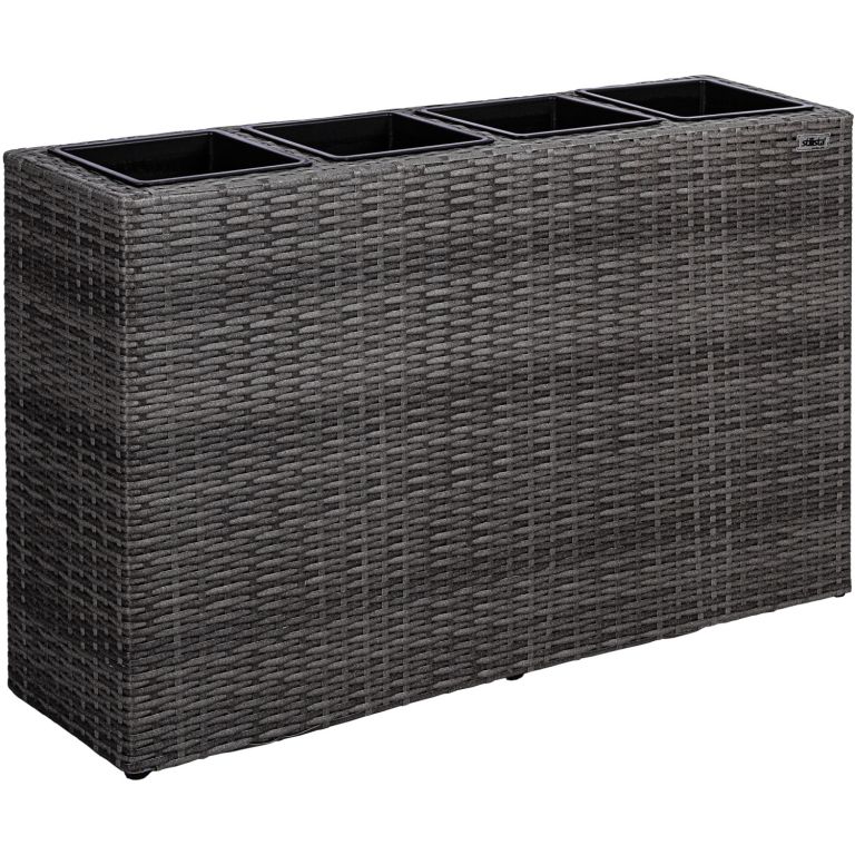 Květináč se 4 vnitřními květníky je ideální pro výsadbu na zahradě, na terase, na balkoně nebo v bytě. Květináč lze použít také jako rozdělovač místností. Polyratan z plastových vláken vyniká vynikajícími vlastnostmi: odolává povětrnostním vlivům, UV záření, odpuzuje nečistoty a snadno se čistí. Tato sada květináčů se skládá z polyratanového rámu a čtyř vyjímatelných plastových květináčů s uzavíratelným odtokem vody.