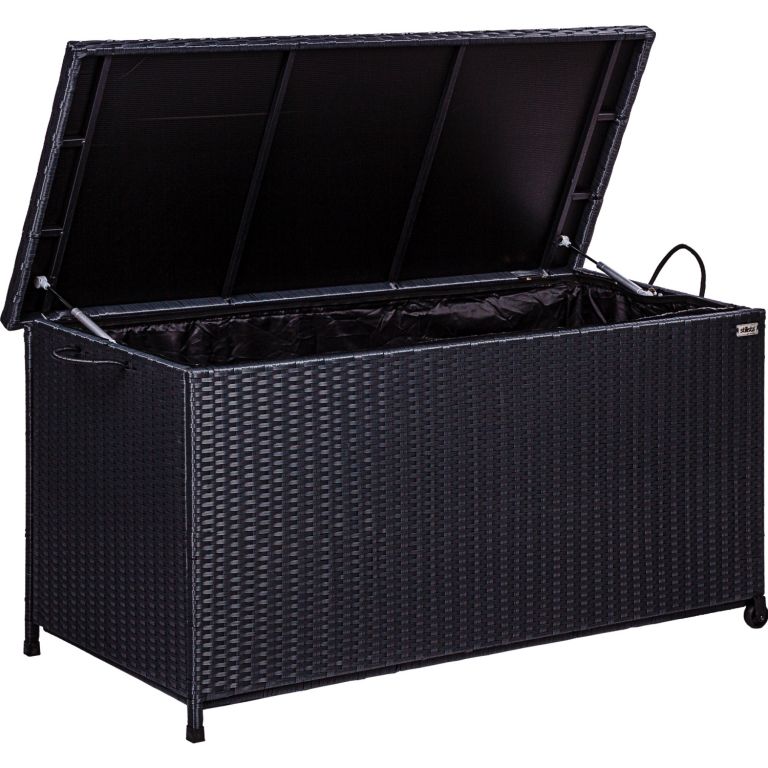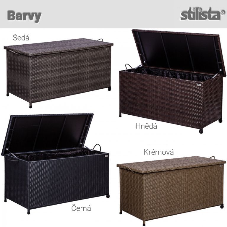 Polyratanový box na polštáře je navíc vybaven dvěma úchyty a dvěma kolečky, takže se s ním snadno manévruje. Zahradní box STILISTA má vodoodpudivou a odnímatelnou vnitřní plachtu z polyesteru. Náš zahradní box na polštáře je ideální jako truhla na různé věci, sedáky nebo zahradní náčiní. Díky automatickému zvedacímu mechanismu zůstává víko spolehlivě na místě, a proto se snadno otevírá.