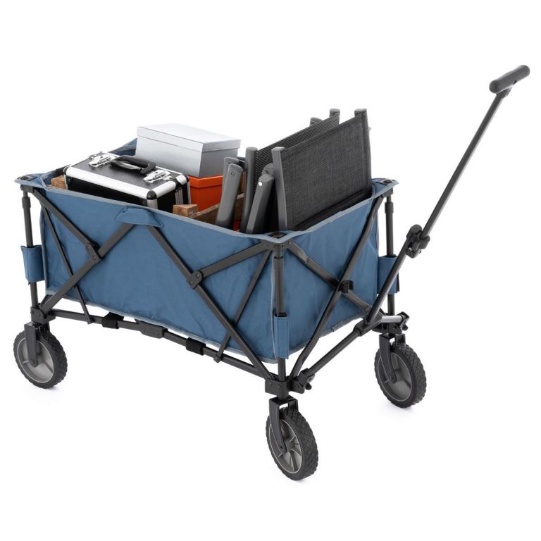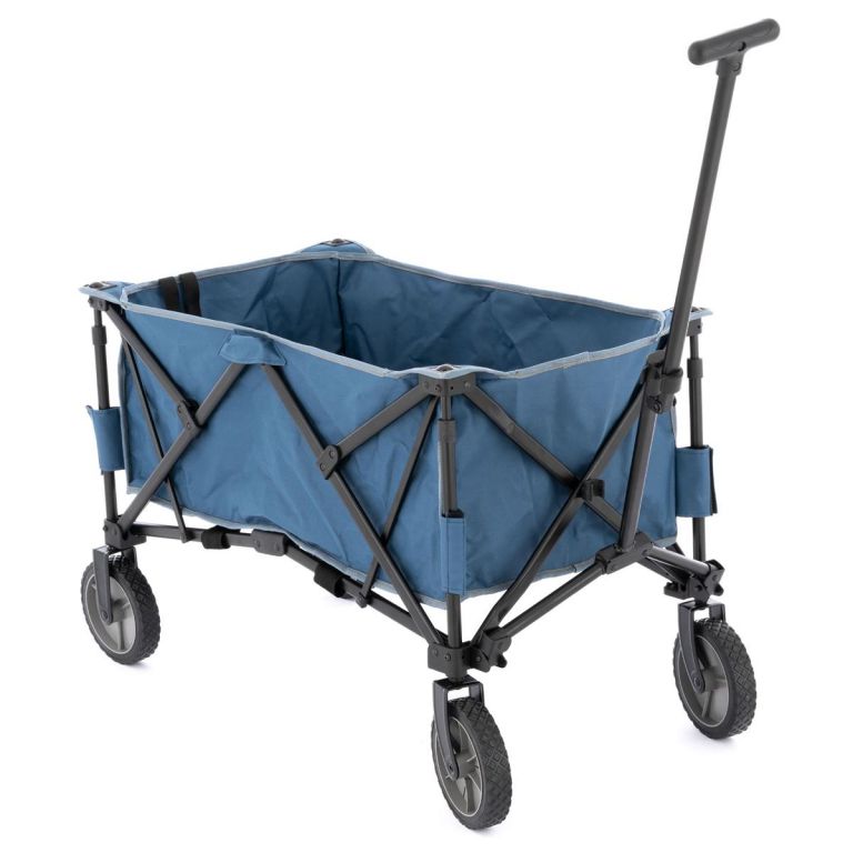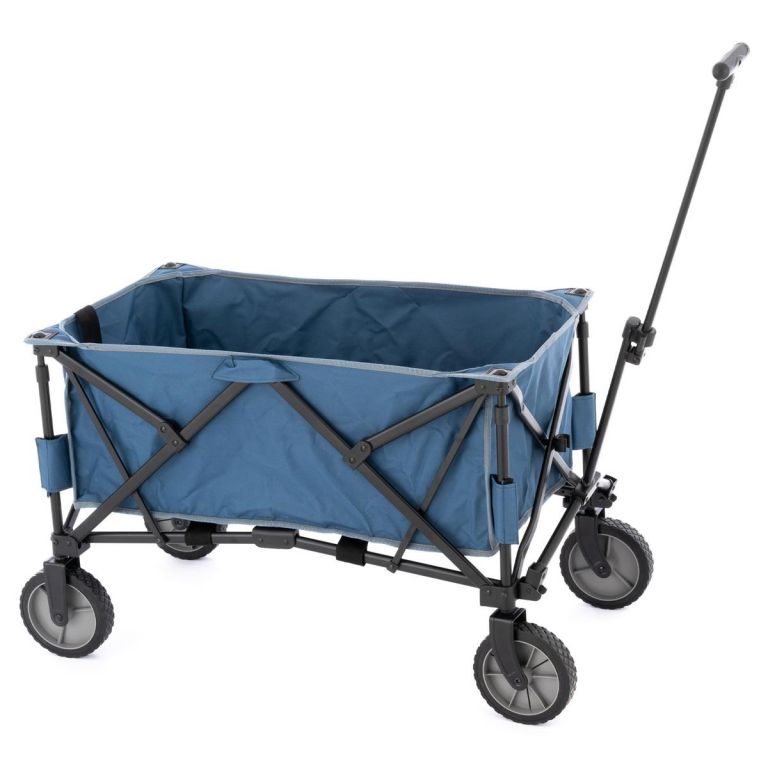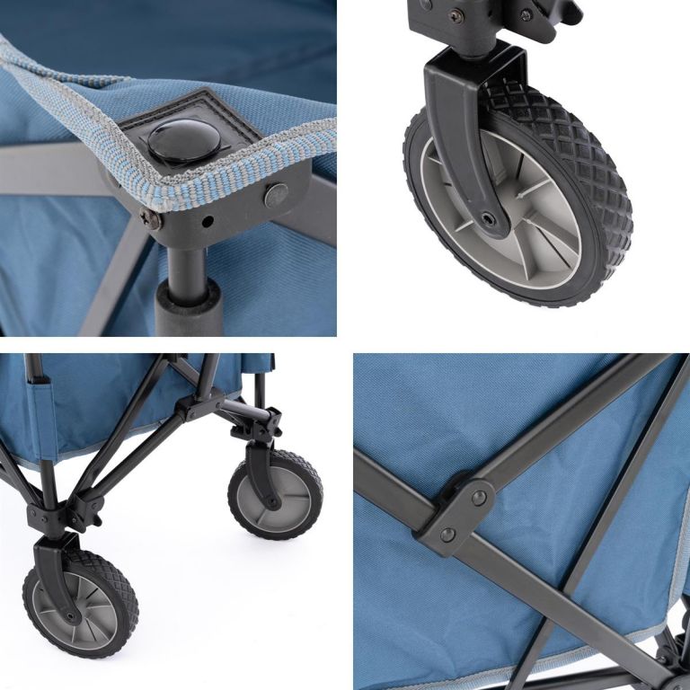 S naším stabilním a praktickým vozíkem můžete snadno a pohodlně přepravovat svá zavazadla v kempu, vaše piknikové náčiní při procházkách, plážové vybavení. Voděpudivý, pevně tkaný látkový potah a pevné zpracování zaručují nosnost až do 200 kg. Další odnímatelná skládací podlahová rohož poskytuje větší stabilitu a měla by být před složením odstraněna. Skládací vozík lze snadno přepravit na místo použití, otevřít a okamžitě použít.