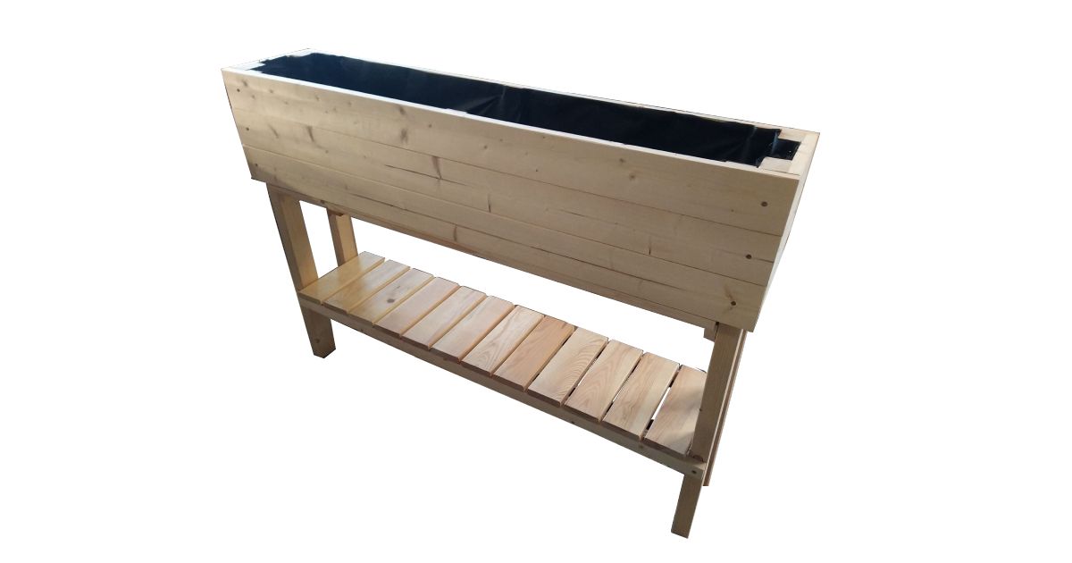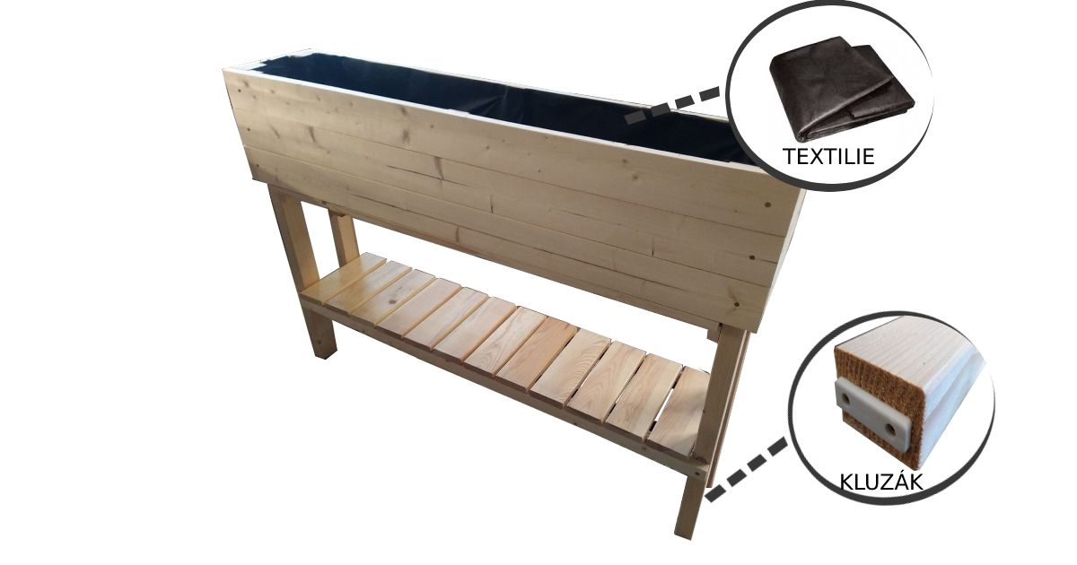 Záhon je vyvýšený pro snadnější práci bez ohýbání se a klečení. Je vyroben z 20 mm silného materiálu a nohy jsou silné 40 x 60 mm. Police pro uložení nářadí k pěstování a sadbě. Geotextilie je součást balení produktu a slouží k oddělení zeminy od záhonu. Ze spoda má záhon plastové kluznice pro lepší stabilitu a aby dřevěné nohy nebyly v kontaktu se zemí. Záhon se hodí k pěstování na balkonu, nebo u domu na terase.