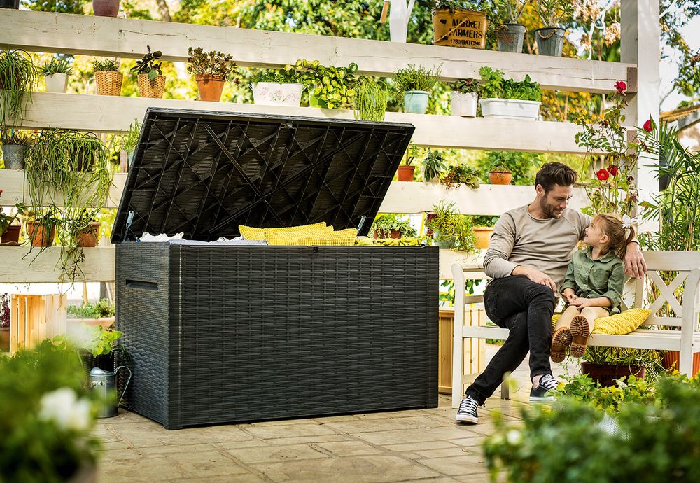 Odkládací box umožňuje pohodlně uložit vše, co chcete mít po ruce na Vaší zahradě. Díky velkému objemu se do něj vejde například – zahradní nářadí, hračky, polštáře nebo přikrývky. Jeho montáž je velmi jednoduchá a nevyžaduje žádné specializované nástroje. Mechanismus, který usnadňuje otevření víka je nepochybně velkou výhodou produktu. Je velmi výhodný i svou nepromokavostí.